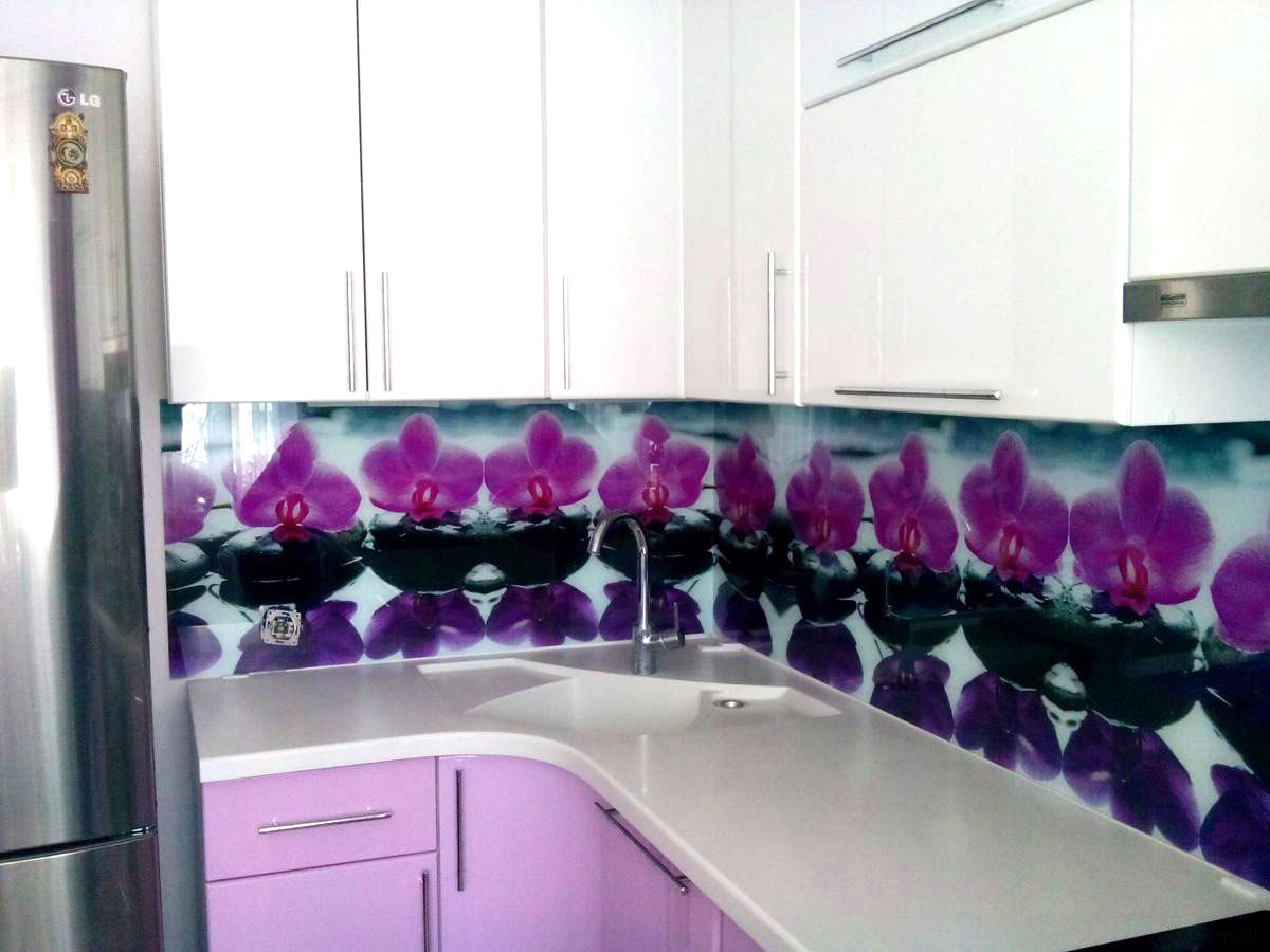 Яркость фартука и большое количество орхидей "утяжеляет" общий вид кухни. Идея с орхидеями оригинальна, но я бы изменил рисунок, приуменьшил контраст цвета и количество цветов.